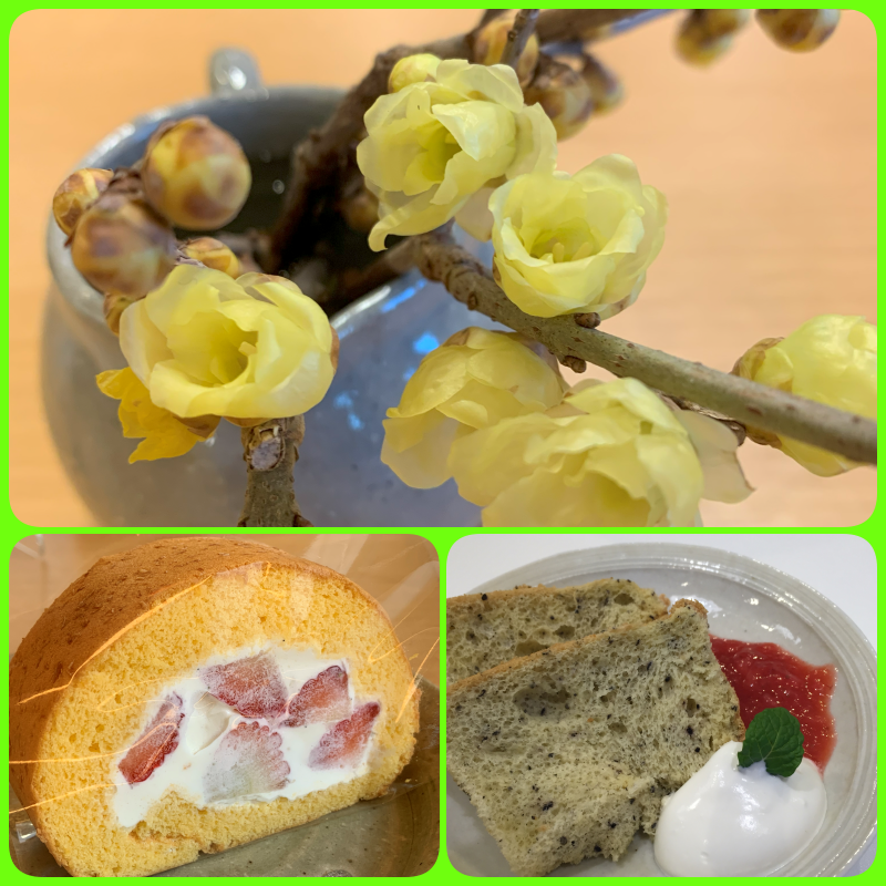 今週はイチゴのロールケーキとゴマのシフォンケーキをご用意しています。もう一つお客様から頂いたいい香りのする「蝋梅」もあり、外は寒いですが中は皆様の優しいお気持ちがいっぱいあって温かいです。♡寒さに負けずに元気に過ごしたいですね。今週もどうぞよろしくお願い致します。