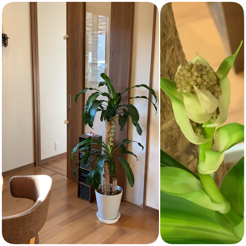 まだ花は開いていませんが”夜になると閉じていたつぼみが一斉に開き始める”ということで夕方になると気をつけてみているのですが名前にフレグランスとついているように香りの強い花が咲くようです。ドラセナ・フレグランスマッサンゲアナ、別名「幸福の木」として知られていて、上に伸びていく観葉植物は「陽」の性質があり、飾ると良いエネルギーを出すと言われることから縁起物のお祝いとして重宝されているようです。”幸福の木は大きく育っていくと花が咲くことがあり、毎年花が咲くこともなく、咲く時期も決まっていない”そうですが、花が咲くと株が弱るということで後を大事にしてあげなくてはいけないようです。(いただいた方にも改めて感謝と報告をしました)