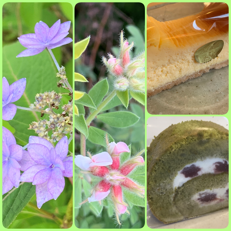 今週は抹茶のロールケーキとプレーンのチーズケーキをご用意しました。冷たいカタラーナやゼリーもよく出ています。ふと庭に目をやるとヤマアジサイやロータスブリムストーンも綺麗な花を咲かせていました。季節は進んでるようです。ただ気温の変化が大きいせいか体調を崩しておられる方も多いいようです。今週も体調に気をつけてどうぞよろしくお願い致します。